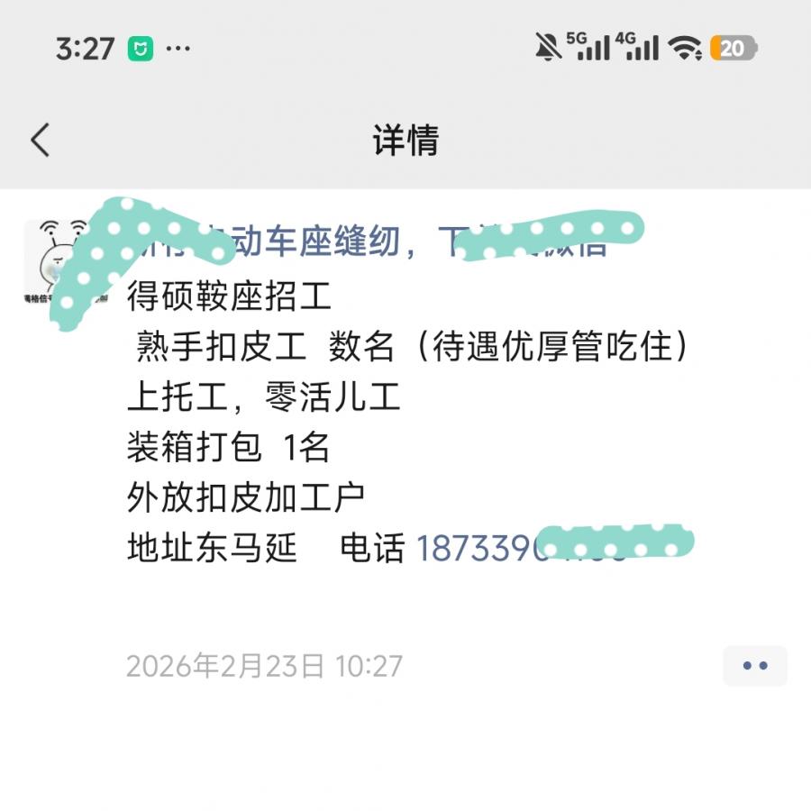 得硕鞍座招工 熟手扣皮工 数名(待遇优厚管吃住) 上托工,零活儿工 装箱打包 1名 外放扣皮加工户 地址东马延